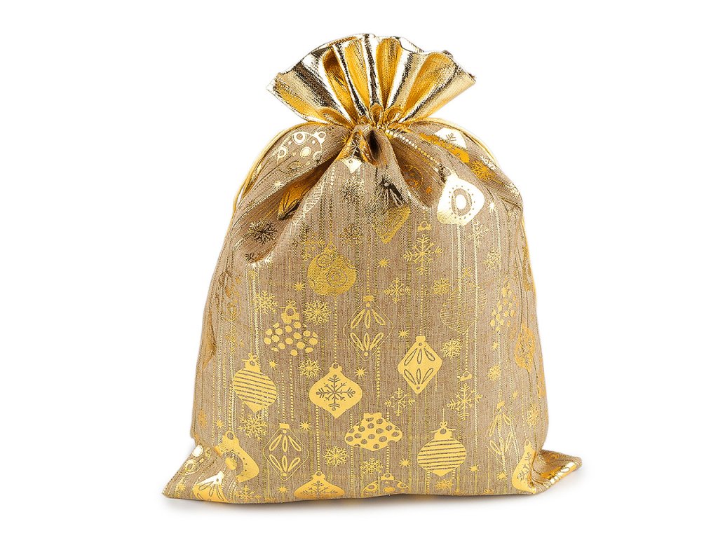 Dárkový pytlík se třpytivým potiskem vánočního motivu je ideální dekorací na Vánoce. Pytlík je zajímavý materiálem, který imituje jutu, a lesklým lemem i potiskem. Stahuje se pomocí kulaté saténové šňůrky. Do pytlíku můžete schovat drobné dárky nebo jej použít jako vánoční dekoraci.- Šíře: 30 cm