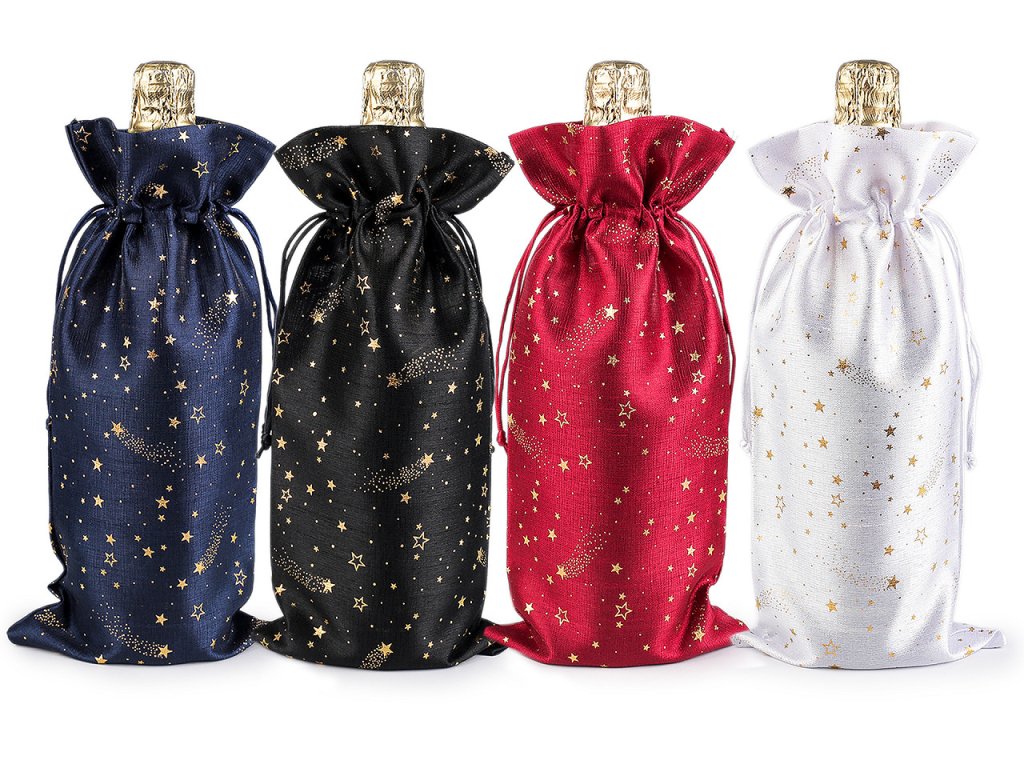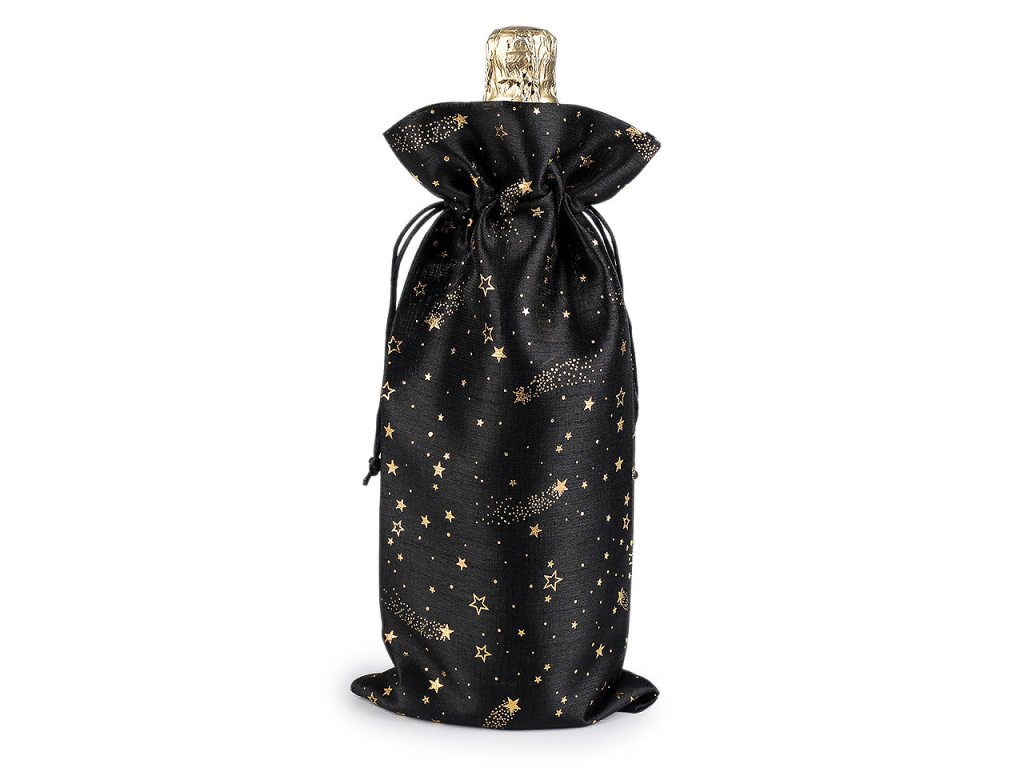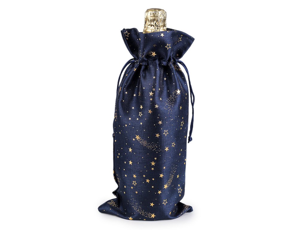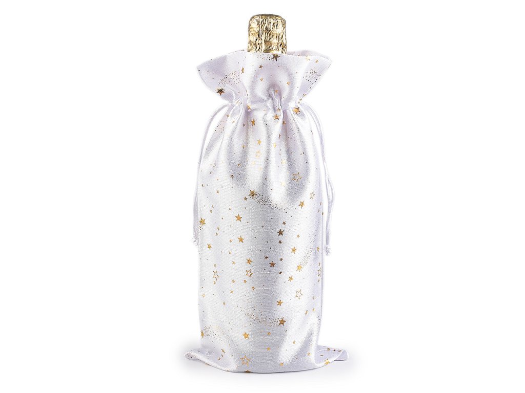 Vánoční dárkový pytlík ozdobený zlatým metalickým potiskem hvězdiček působí elegantně a luxusně. Je určený na zabalení lahví a jiných podlouhlých dárků. Pytlík je dostatečně vysoký, ať už se rozhodnete pro dárek s alkoholem nebo s domácí limonádou, ušetří vám čas při balení. Stahuje se pomocí kulatých saténových šňůrek, dárku dodá osobní kouzlo a půvab. Láhev není součástí pytlíku.- Šíře: 15 cm
