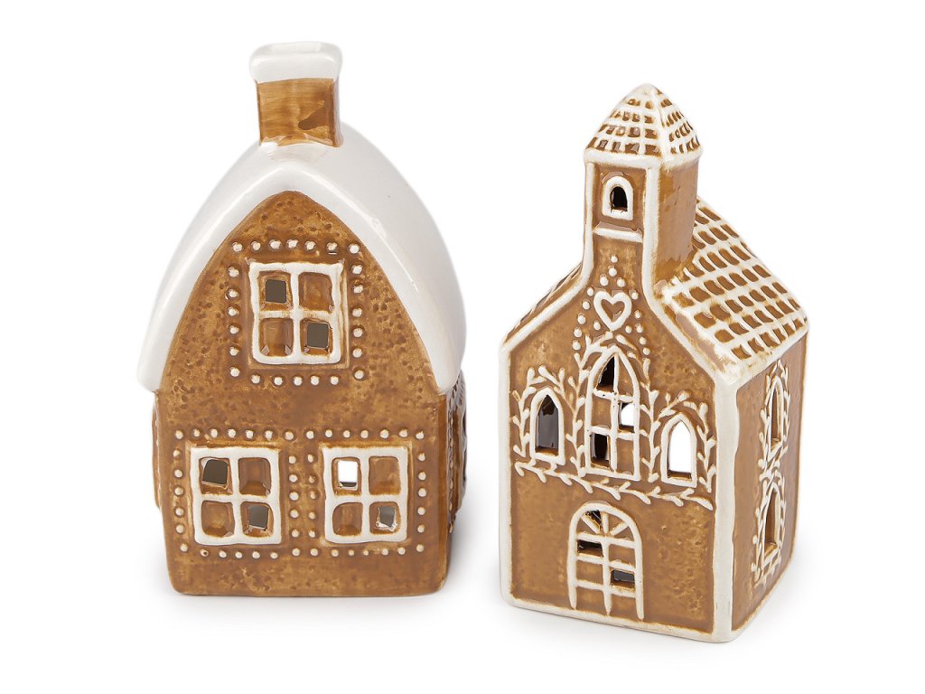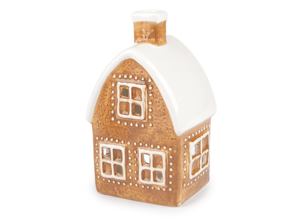 Keramický svícen ve tvaru chaloupky či kostela vnese do vašeho domova příjemnou a relaxační atmosféru. Svým designem imituje perník. Je vhodný na klasické čajové nebo LED čajové svíčky. Perfektně vynikne jako ozdoba vánočního stolu, okenního parapetu či jako součást svátečního aranžmá.- Rozměry: č. 1: 10 x 16 x 8,5 cm