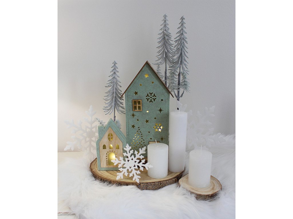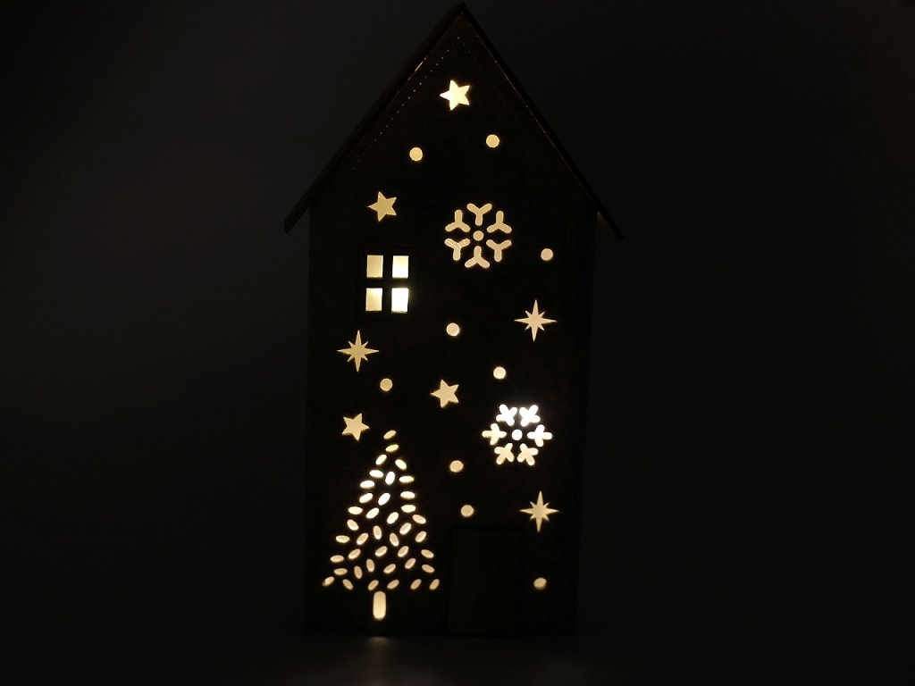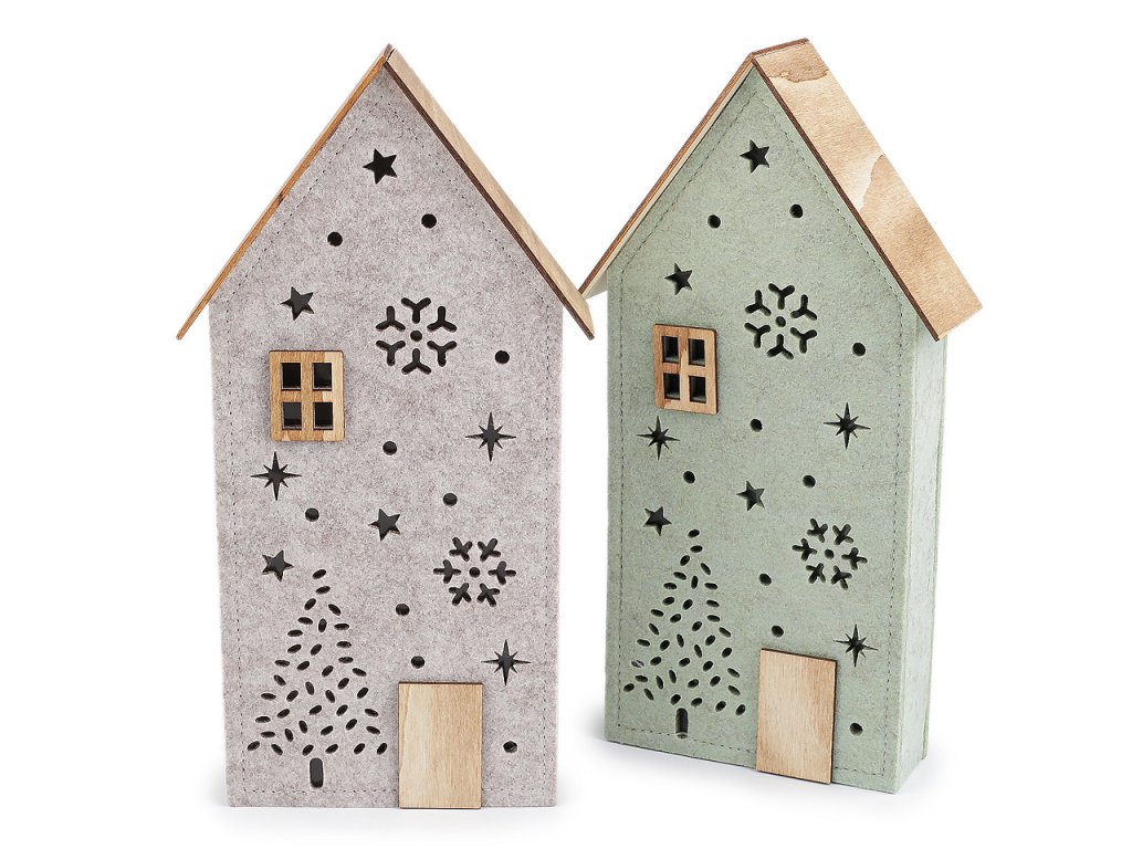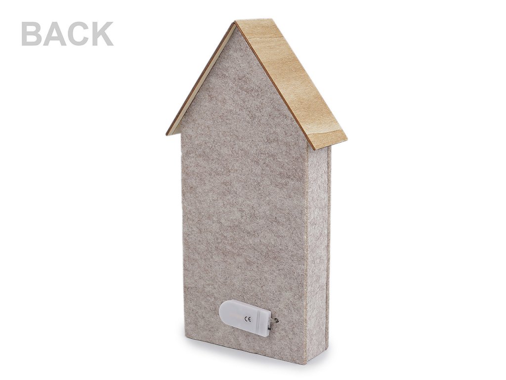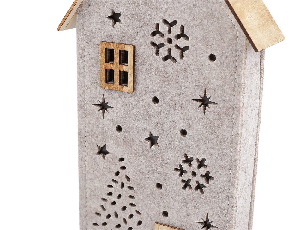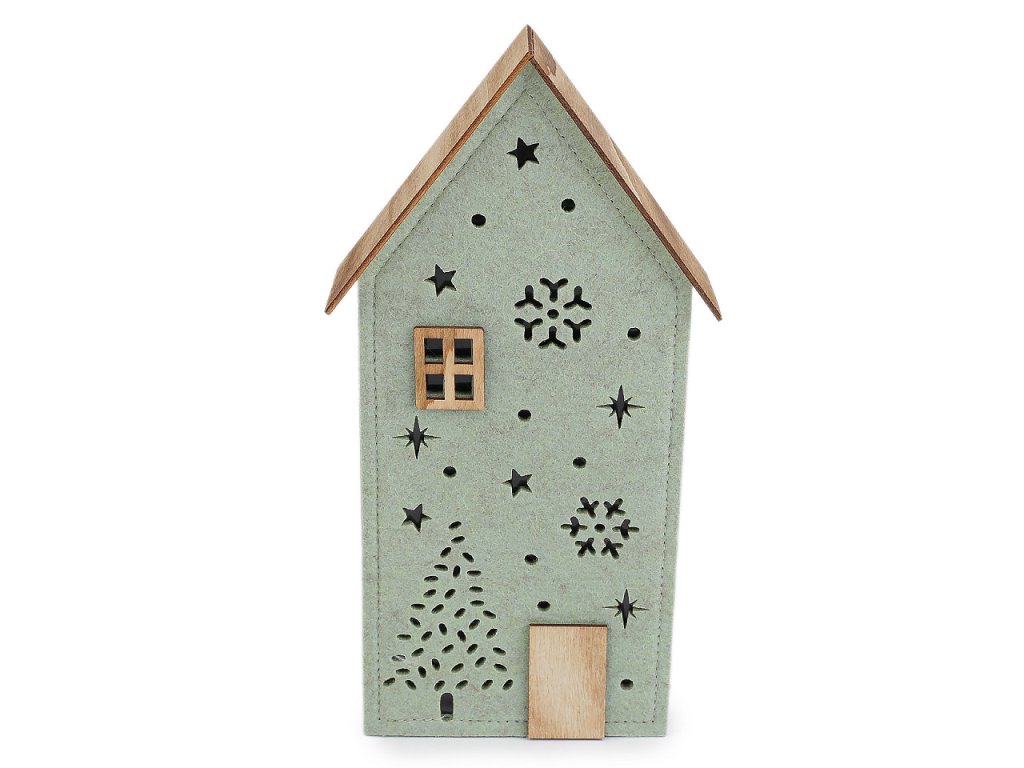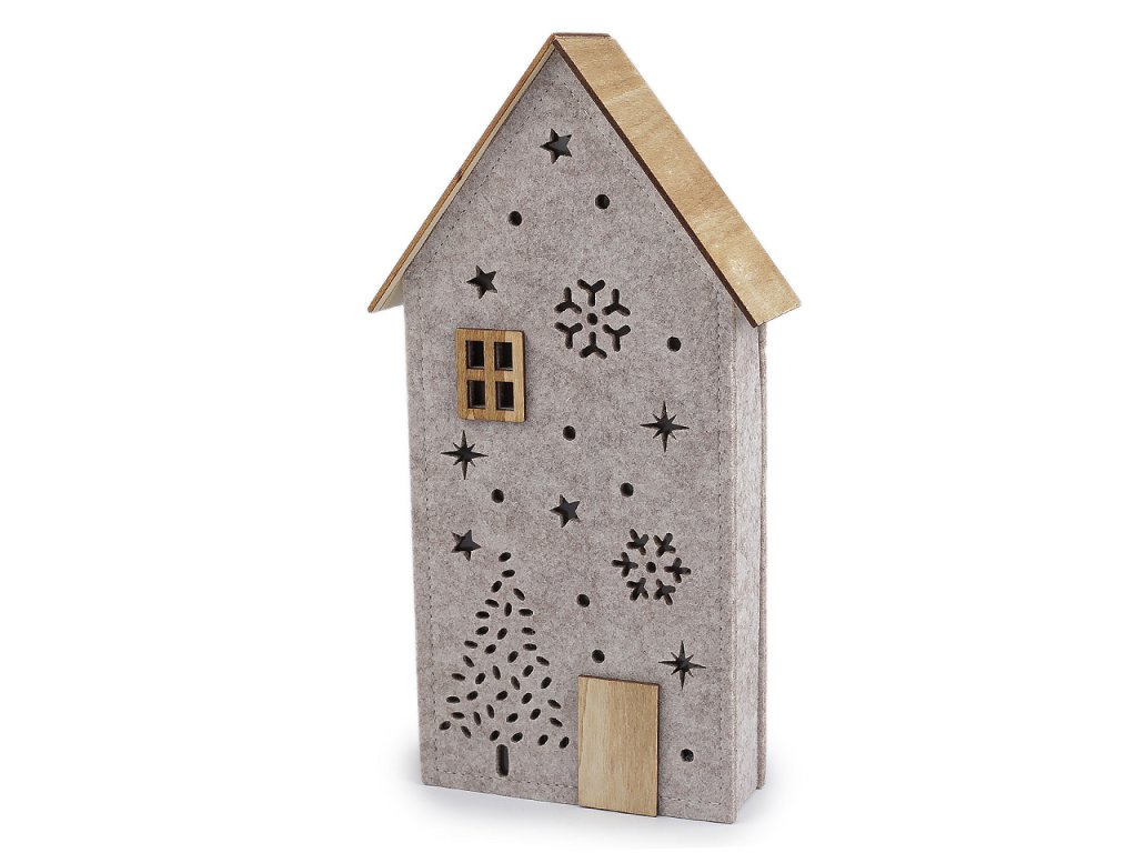 Svítící dekorační domeček má základ z pevného filcu a střechu a detaily ze dřeva. Ze přední strany má výřezy v podobě vloček, hvězdiček a stromečku. Svítí příjemným teplým světlem. Zútulní každý interiér. Baterie (2x CR2032) jsou součástí balení.- Rozměry: 15,5 x 6 cm