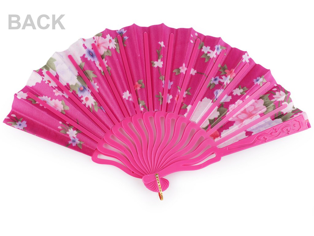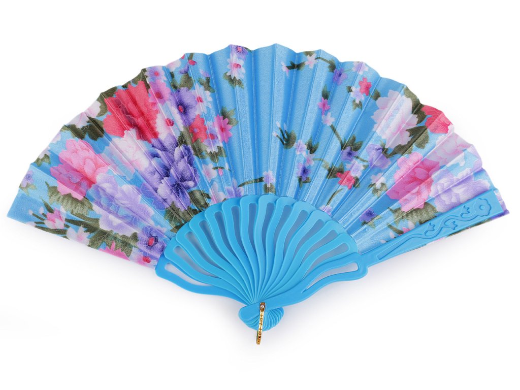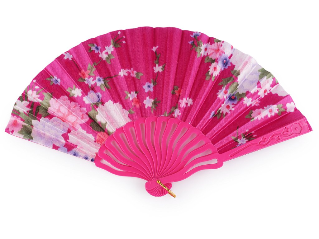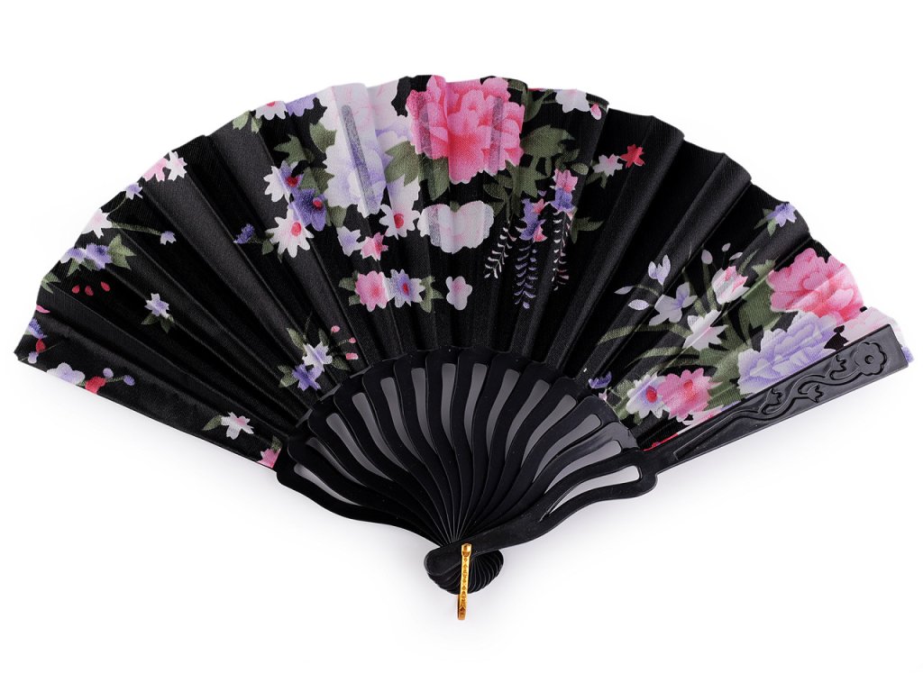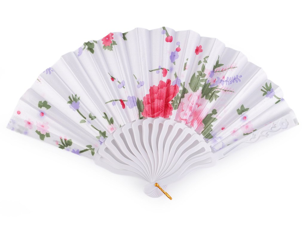 Textilní vějíř zdobí potisk květů. Využijete ho na společenské události, na karnevaly i různá taneční vystoupení. Rukojeť je plastová s poutkem. Vějíř je ideální pro horké letní dny, kdy potřebujete rychlé osvěžení, stane se vaším oblíbeným společníkem při každé příležitosti.- Délka: 23 cm