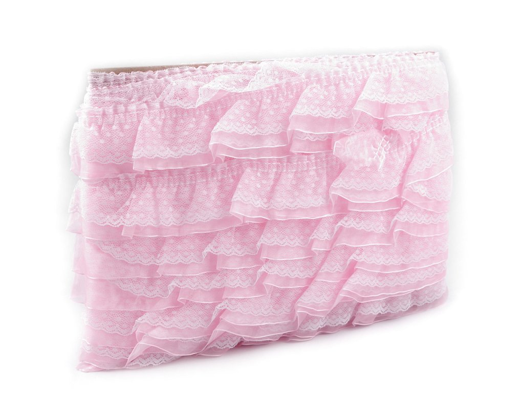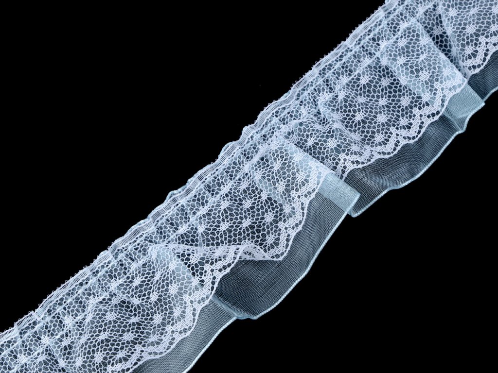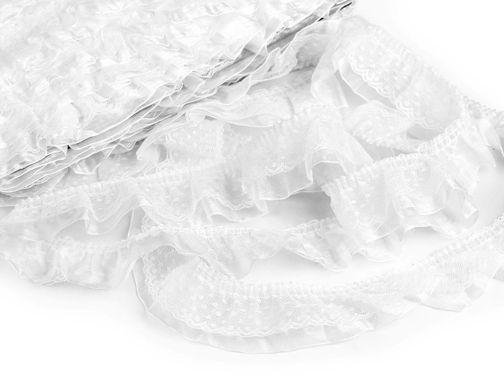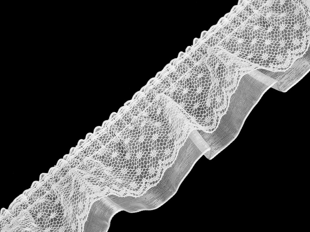 Dvojitý volánek je lehce nařasený a pevně prošitý. Spodní vrstvu má z lesklé organzy, horní vrstvu krajkovou. Volánek využijete na ozdobení podvazků, spodního prádla, šatů, sukní, halenek, svatebních doplňků apod.