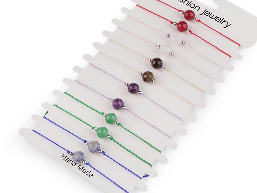 Díky ní má náramek univerzální velikost. Balení 12 ks se prodává jako sada na papírové kartě k zavěšení, viz foto. Náramek č. 9 a 10 obsahuje syntetický minerál.