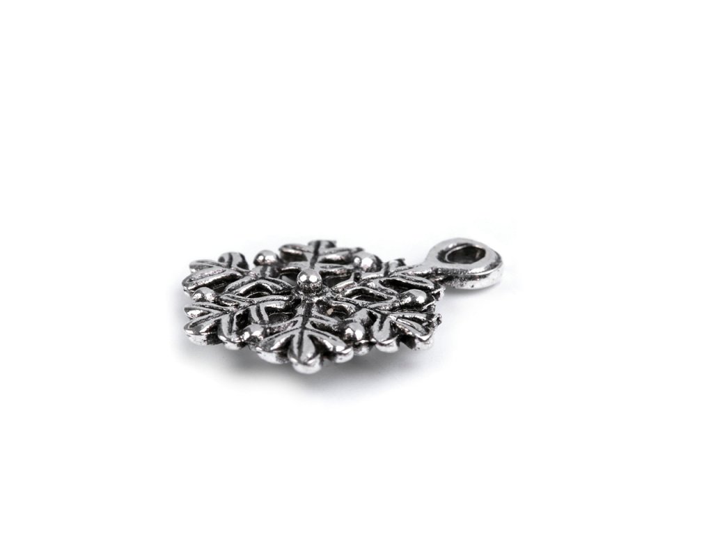 Malý kovový přívěsek ve tvaru sněhové vločky je plochý, oboustranný.
