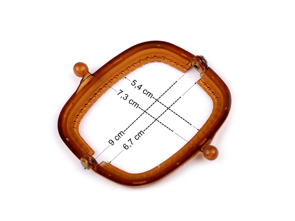 Lehký plastový rámeček využijete na výrobu peněženky. Je určený k našití, kdy se látka dovnitř vloží a ručně přešije přes dírky, jejichž rozpětí je 4 mm. Dírky jsou jen na vnější straně rámečku, která je delší než vnitřní, tudíž je našívání jednodušší. Vnitřní rozměry rozvoru jsou 6,7 x 5,4 cm. Vnější rozměry rozvoru jsou 9 x 7,3 cm. Výška zavřeného rámečku je 4 cm (včetně zapínání 5 cm).- Zavřený rámeček: 9 x 4 cm