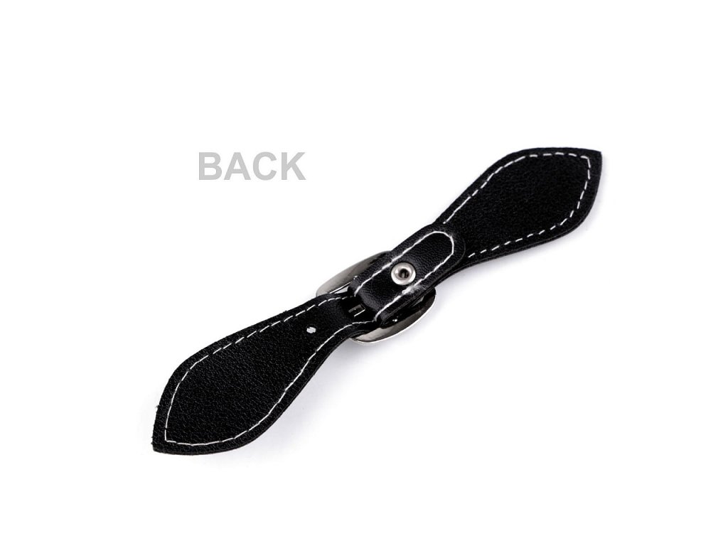 Zapínání z eko kůže se skládá ze dvou částí, které se přišívají nebo přinýtují k materiálu. Je vhodné k výrobě kabelek, tašek, opasků, kabátů, svetrů apod.