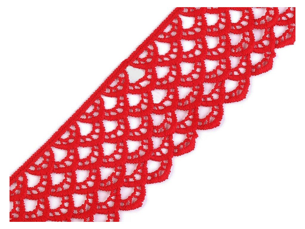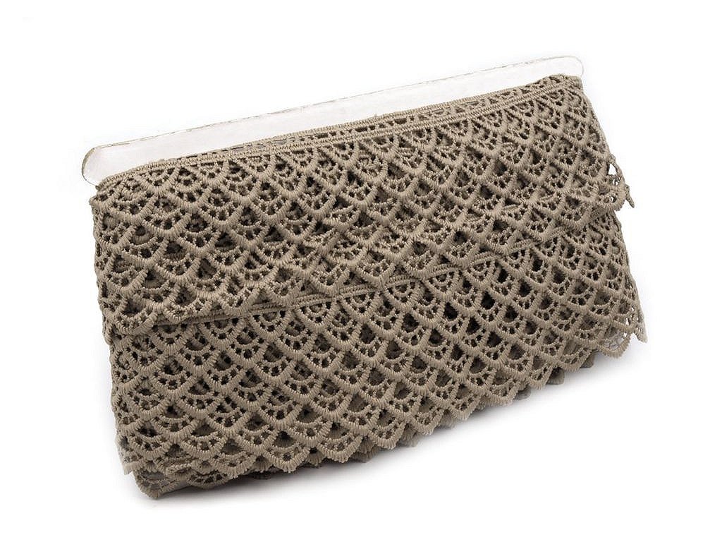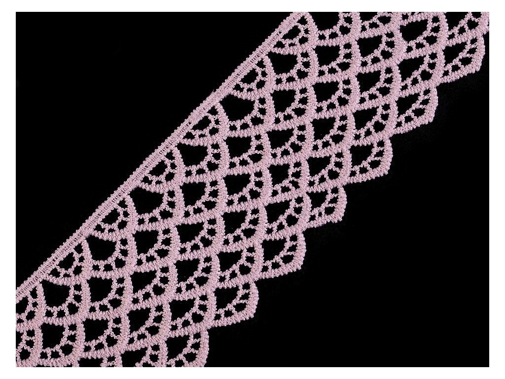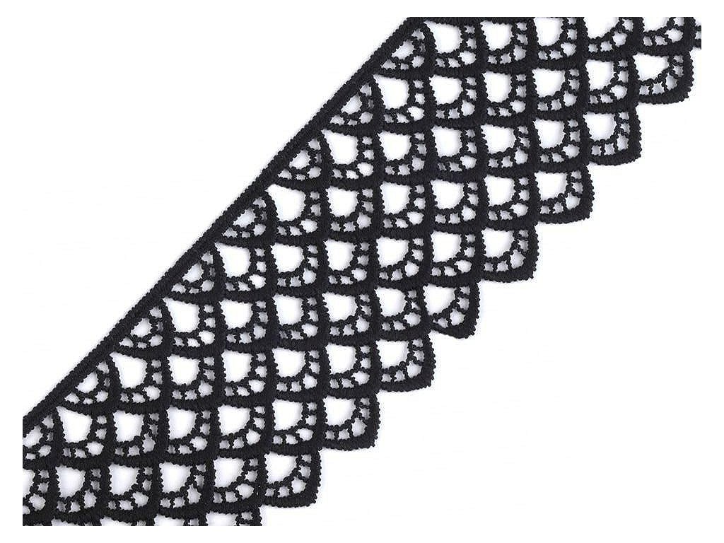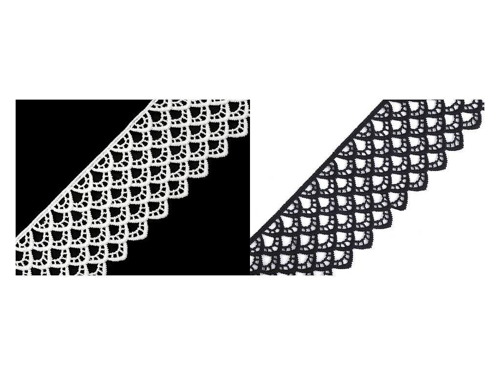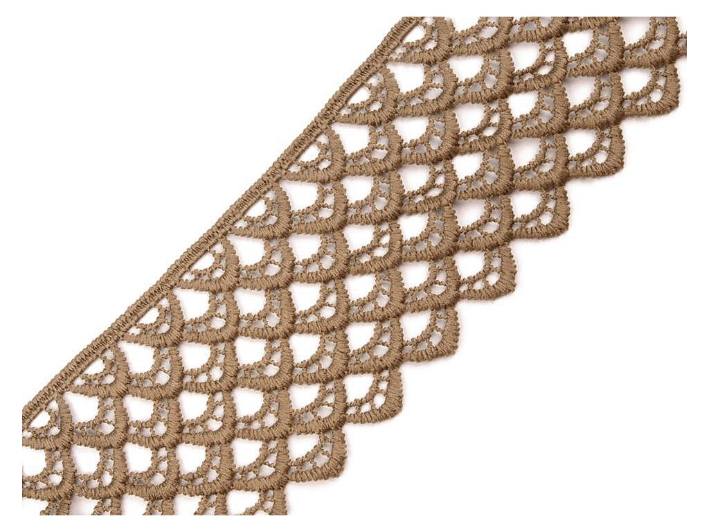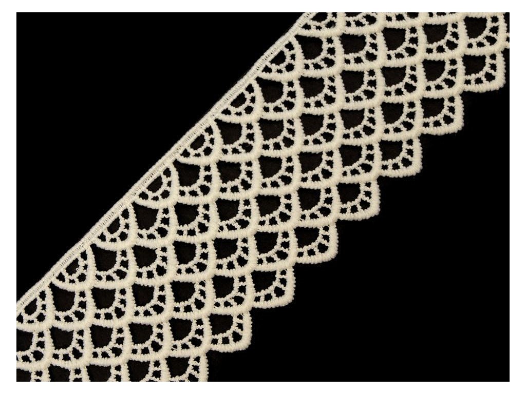 Vzdušná krajka se zajímavým vzorem je složena z umělého hedvábí. Je vyrobena stejnou technologií jako vzdušné krajky, které jsou vyrobené z viskózy a bavlny. Krajka je pevná, není pružná. Použití: Krajkou můžete oživit oděvy, například kraťasy, sukně, halenky apod. Je vhodná také na dekoraci polštářů, ubrusů nebo deček. Šíře krajky se po konečné úpravě může lišit o ±6%.- Šíře: 60 mm