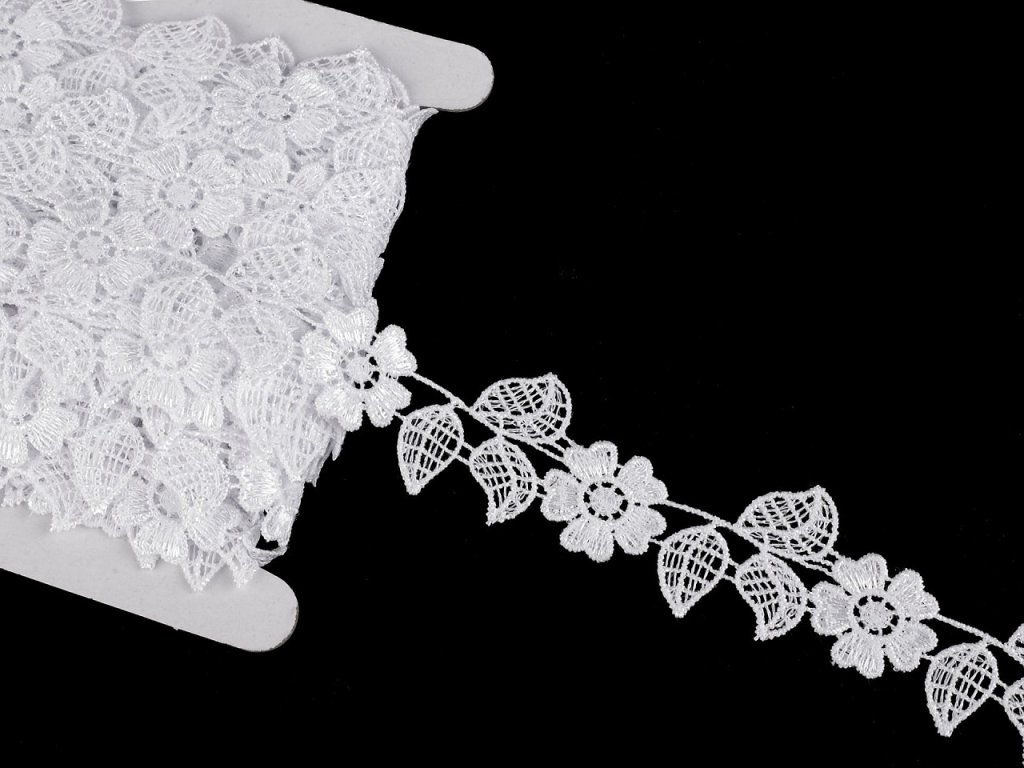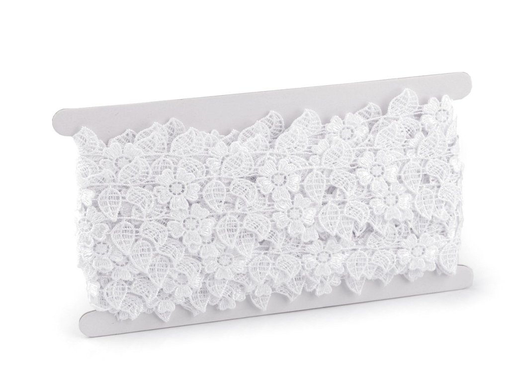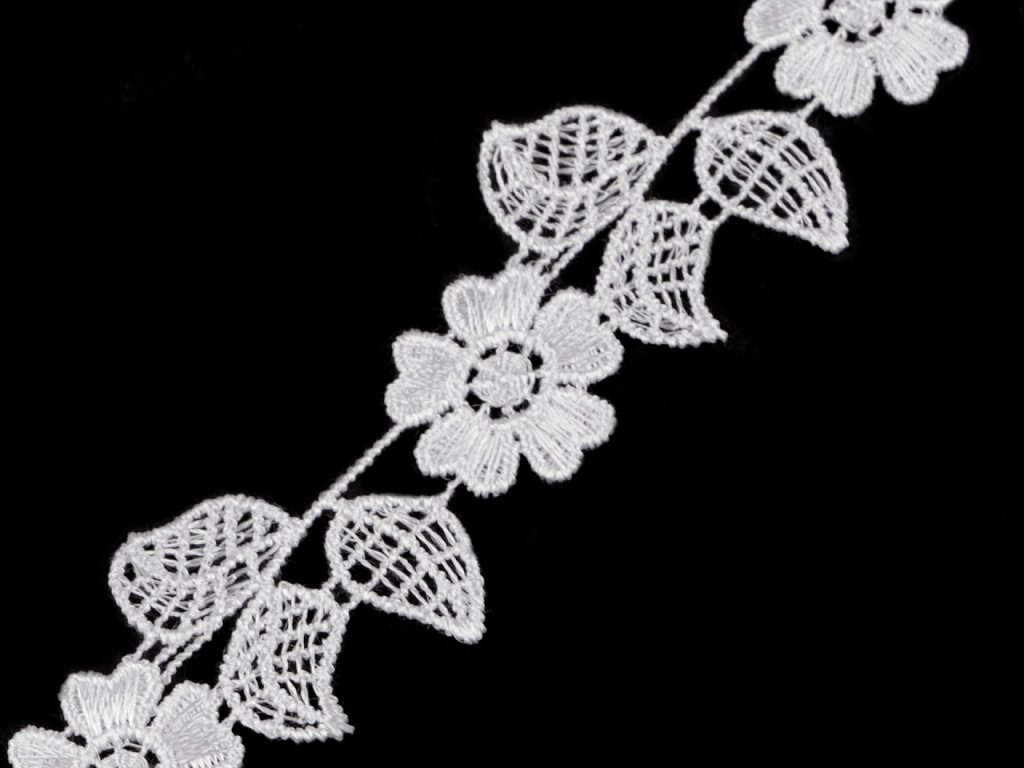 Romantická vzdušná krajka zobrazuje vzor s květy. Dá se ustřihnout a použít i jako vsadka. Použití: vynikne na svatebních šatech, halenkách, spodním prádle, atd. Je vhodná také na ozdobení bytového textilu (např. polštářů) nebo slavnostních psaníček. Délka opakujícího se vzoru - od konce květu po začátek dalšího květu - je 55 mm.- Šíře: 35 mm