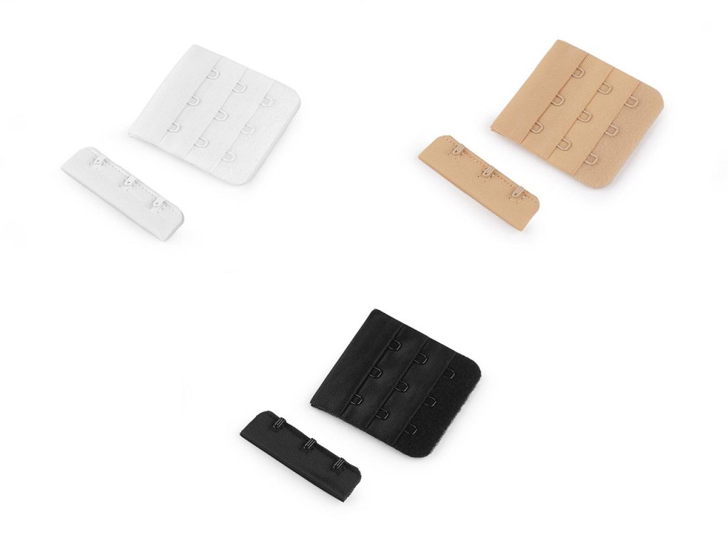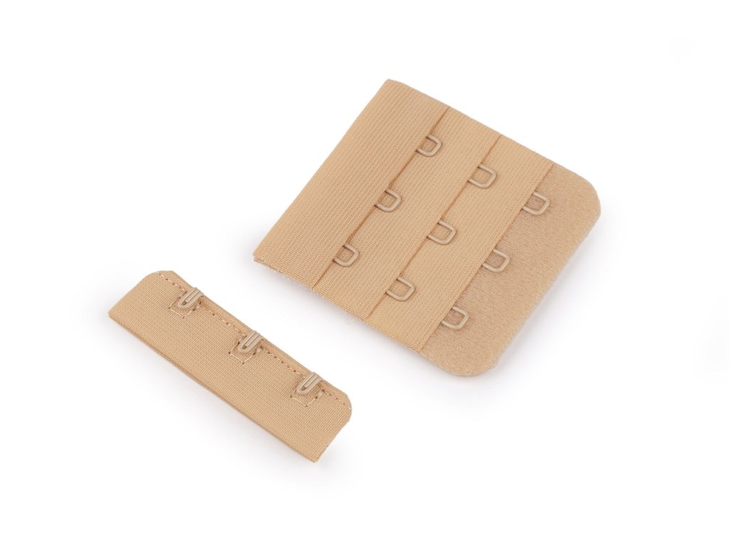 Trojřadé zapínání využijete na výrobu body i podprsenek. Díky své šíři je vhodnější na podprsenky větších rozměrů. Skládá se z klasických oček a háčků. Spodní strana s očky je pokrytá jemným plyšem, který je příjemný na dotek. Očka jsou od sebe vzdálená 1,5 cm.- Šíře: 50 mm