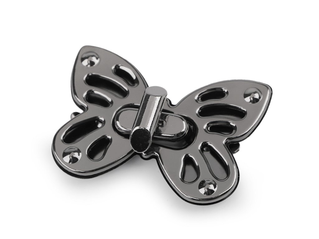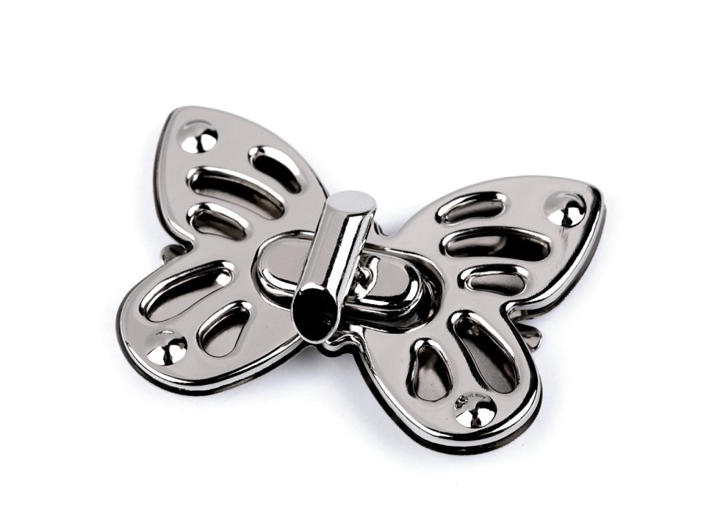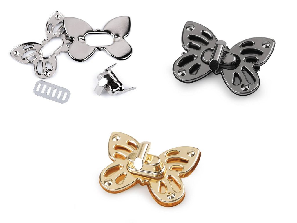 Zapínání ve tvaru motýla na kabelku či tašku se skládá ze čtyř dílů. Plíšek se připevní na vnitřní část tašky, díl s nožkami na vnější část (nožky se zaháknou do plíšku a roztáhnou). Stejným způsobem se připevní i díly s motýlem - část s nožičkami se připevní na vrchní část chlopně. Rozměry: - plíšek: 12 x 26 mm - díl s nožkami: 10 x 21 mm - díly s motýlem: 37 x 52 mm- Rozměry: 37 x 52 mm