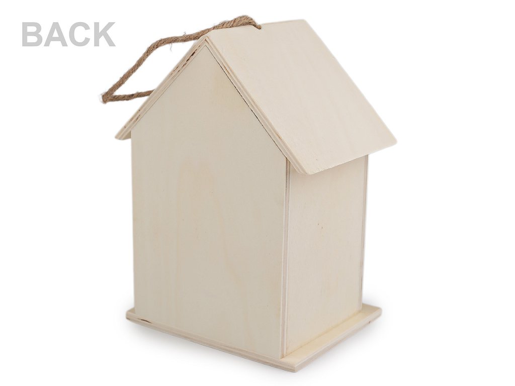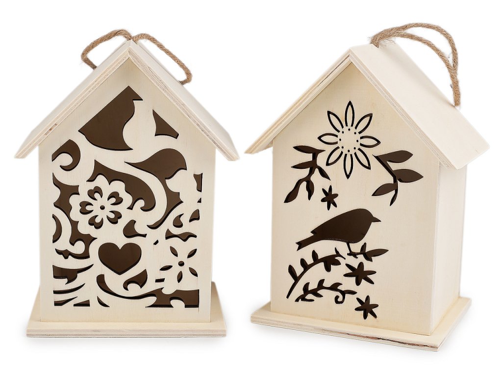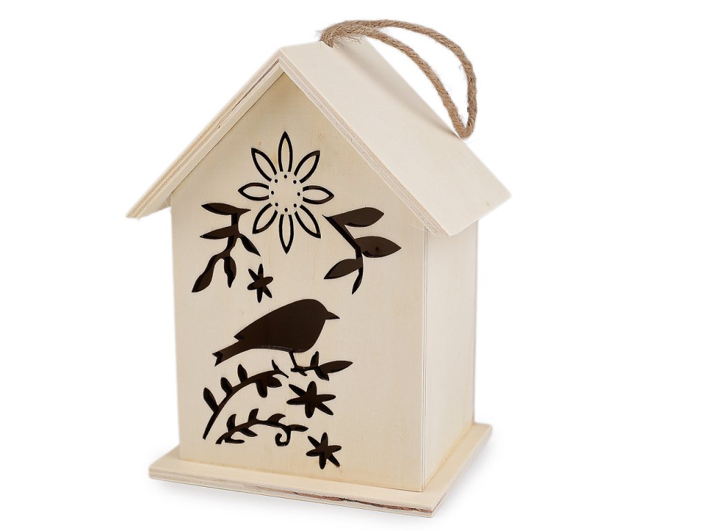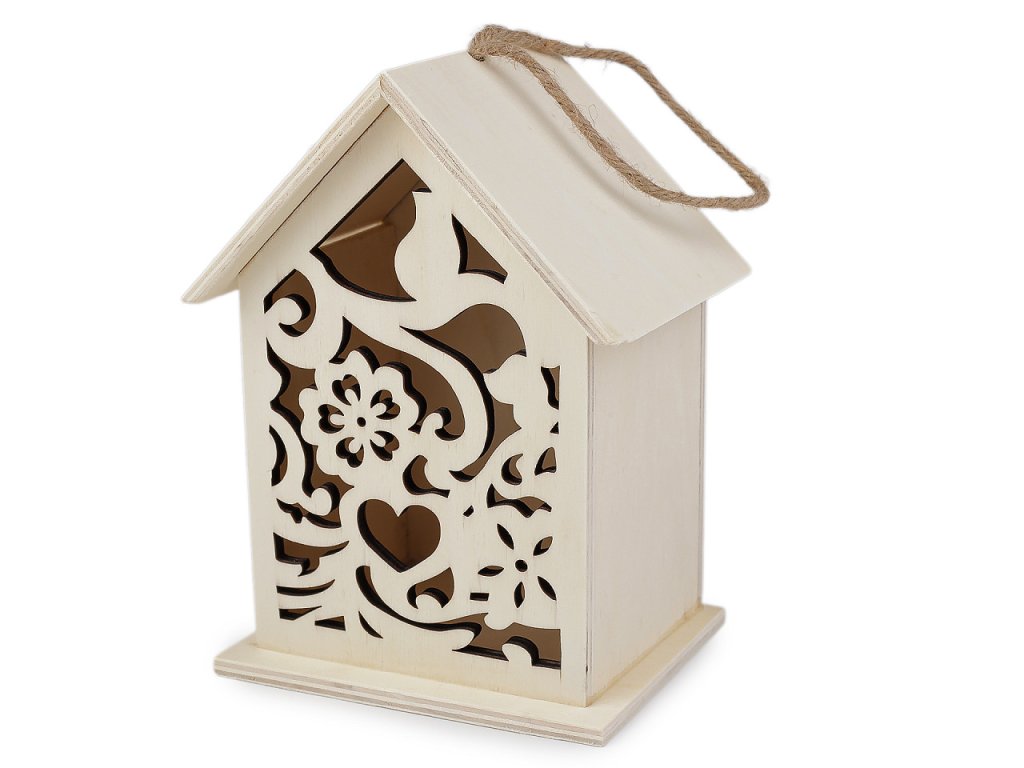 Dřevěný domeček / budka je ideálním doplňkem pro kreativní duše, které si chtějí vytvořit něco jedinečného. Ozdobí vaši terasu, balkón, kuchyň apod. Díky poutku ho kamkoli pověsíte. Dá se domalovat akrylovými či temperovými barvami, popisovači, glitrovými lepidly, barvami ve spreji aj. Přední stranu domečku zdobí precizní výřezy.- Šířka: 14 cm