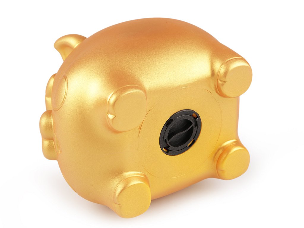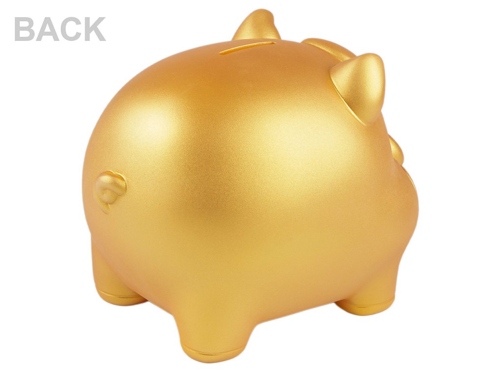 Pokladnička s designem zlatého prasátka je praktickým interiérovým doplňkem i zajímavým dárkem. Dá se použít na svatbě pro vybírání peněz na novomanžele nebo do ní můžete vložit finanční obnos a podarovat ji k narozeninám apod. V dolní části má otvor (Ø3 cm) s plastovou zátkou.- Rozměry: 13 x 20 cm